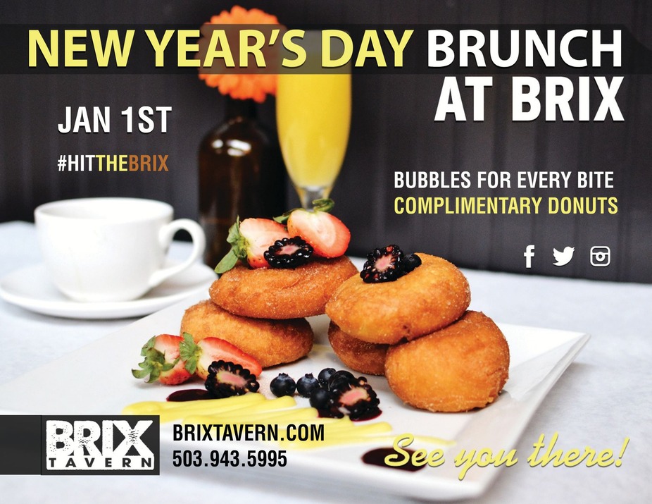 Join us on New Years Day for Brunch and Brix Tavern. Bubbles with every bite and complimentary donuts, can't think of a better way to kick off the new year and recover from the night before.