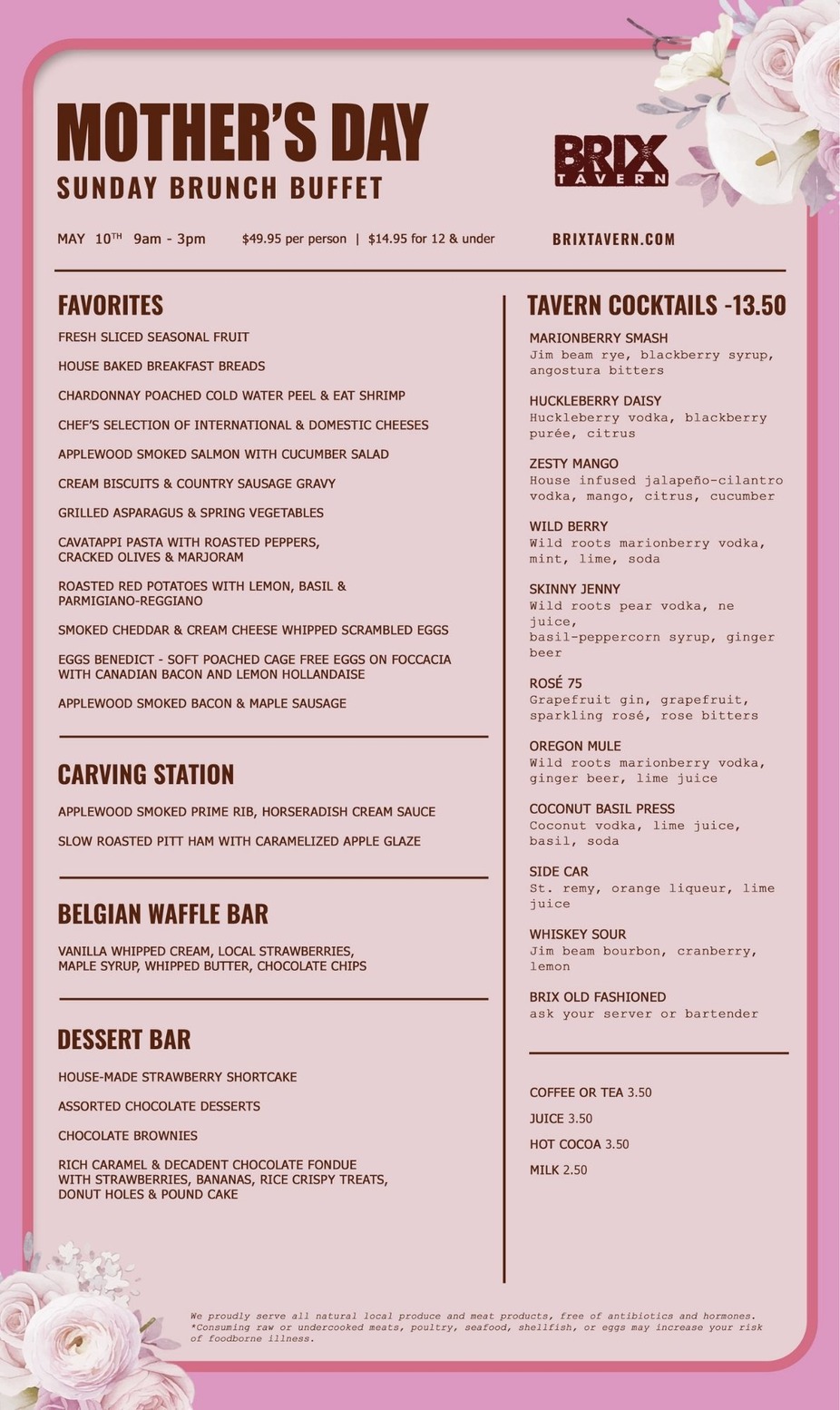 Join us on Mother's Day and treat your mom to a delicious meal! We will be offering a Brunch buffet from 9am to 3pm.