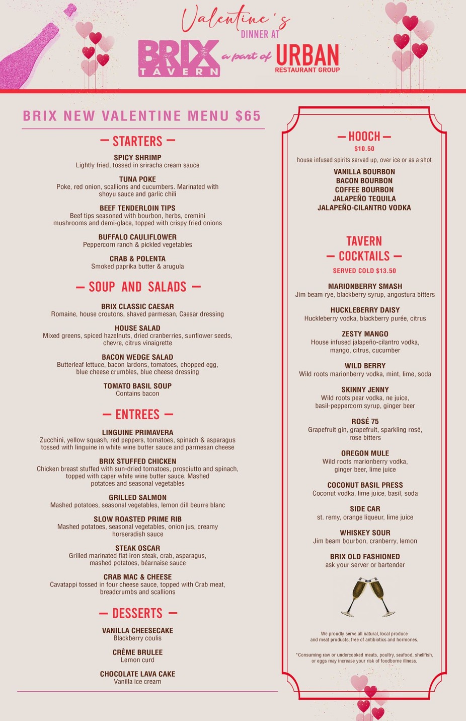 It's not too early to get your reservations in for Valentines day. Brix Tavern will be offering a 4 course prix fix menu starting at 5pm on February 14th.