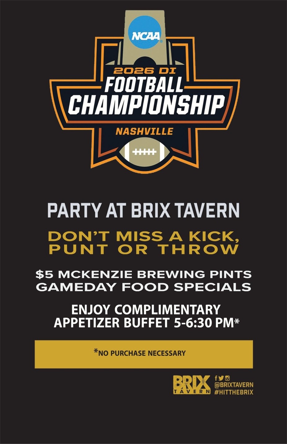 Join us at Brix on January 19th for the College Football Championship game.